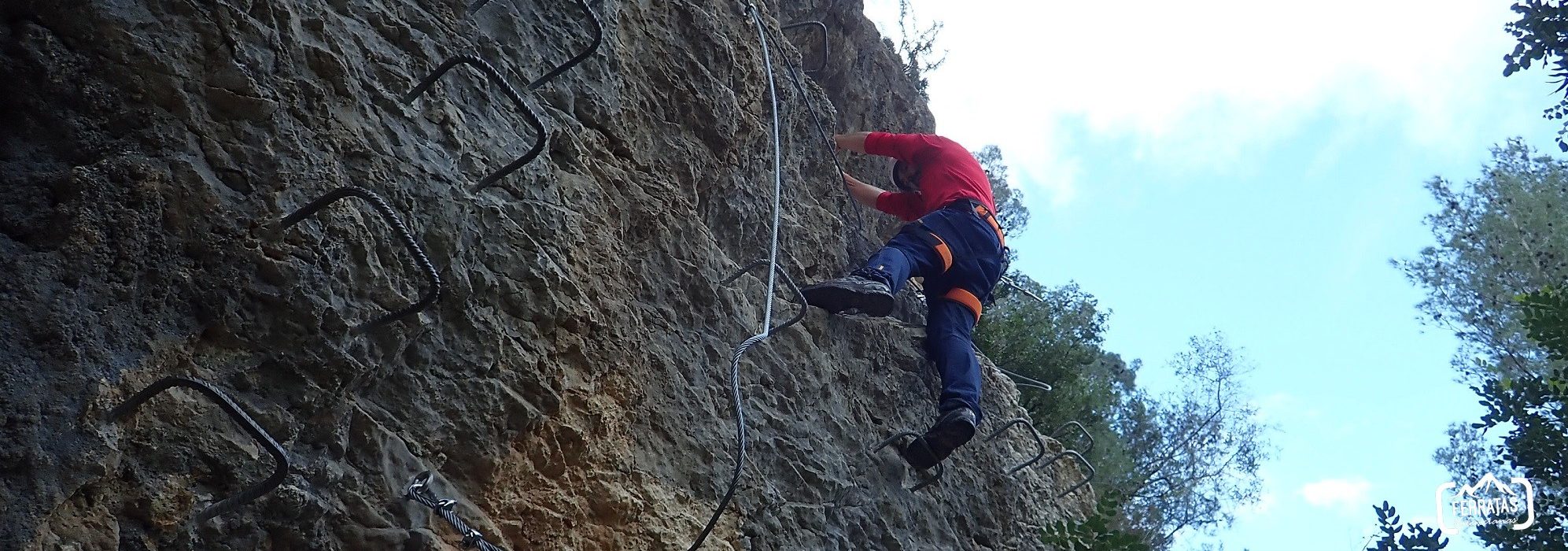 Description of the Ferrata : We pass the ravine and find the beginning of the track. There are sections of short vertical walls that reach ledges where we can walk to the next ferrata points. We continue climbing until we reach a fork sign with K4 section on the left handside and the K2 section on the right handside. When finishing the sections we reach the end of the ferrata with a rappel option (not recommended because of the near trees by).