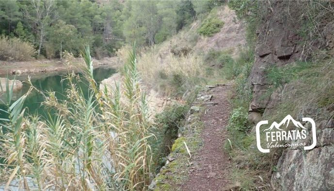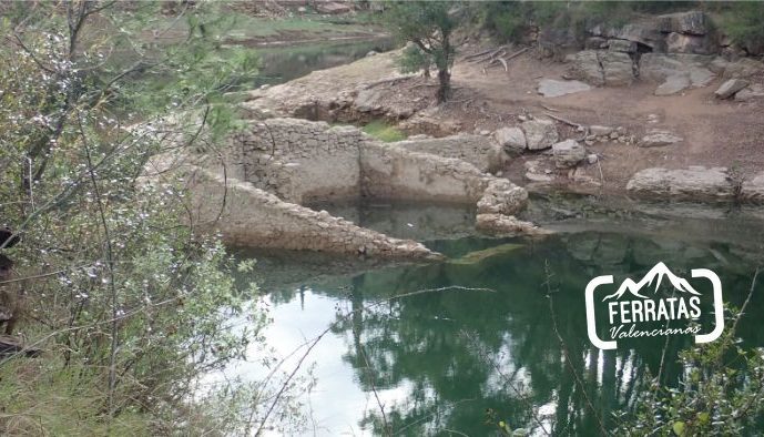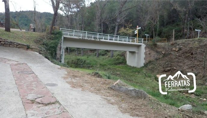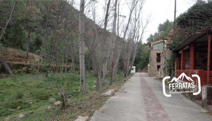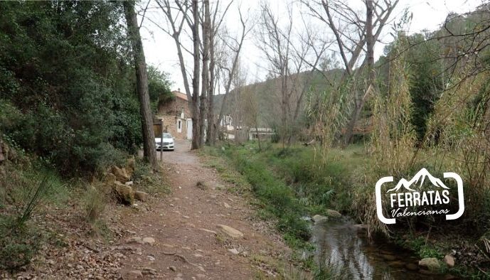 Nos dirigimos hacia el puente que hemos cruzado con el coche y antes de cruzar el mismo sale una calle hacia abajo, derecha, seguimos por esta calle unos 150 metros en total, pasamos por una casa rural que se encuentra a derecha, continuamos y al final de la calle acaba el tramo asfaltado y sale una senda de frente que va en paralelo al río (aguas abajo), la senda pasa por un pequeña chopada y continua en paralelo al río, más o menos entre 5-10 metros por encima de este, durante el trayecto se ven las ruinas de una antigua construcción que están en el agua, continuamos un buen rato y tras pasar una zona con cable en una zona algo más expuesta, llegamos al inicio de la ferrata.