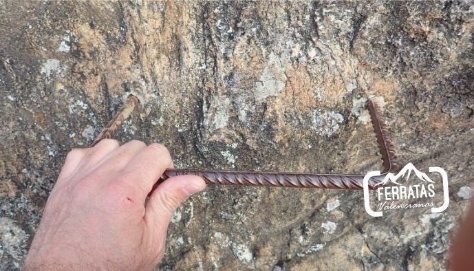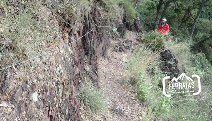 Es una ferrata corta que se hace entretenida porque combina los agarres de manos con la roca natural y con los escalones, tiene un primer tramo más vertical que coge altura rápidamente, tras el mismo va combinado pequeñas subidas en diagonal con zonas horizontales. Ya en la parte más alta se suaviza la verticalidad y se llega al final de la ferrata.
