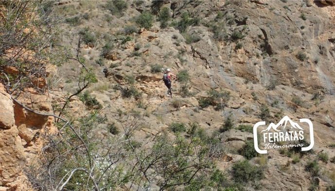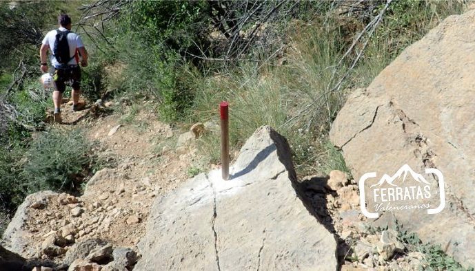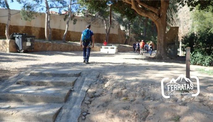 Desde el segundo parking, donde se encuentra el panel de explicación de la ferrata, seguimos la senda que va en paralelo al muro del cementerio, en ligera subida, tras unos 350 metros cruzamos la rambla por la que veníamos, hacia la derecha y continuamos en subida, en dirección al “Polígono” tras otros 150 metros empezamos a ver estacas a izquierda, abandonamos el PR (señales blancas y amarillas) y seguimos las estacas y en otros 150 metros llegamos al inicio de la ferrata.