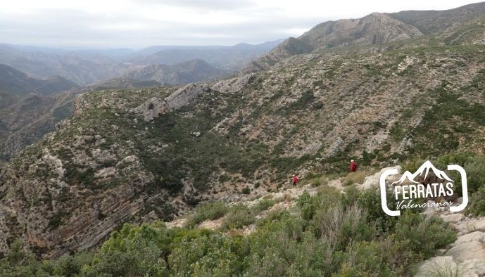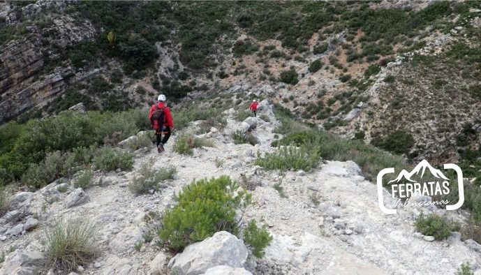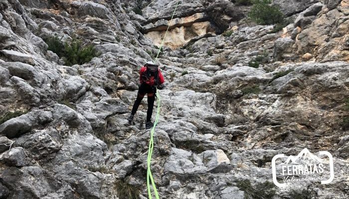 Retorno: Desde la reunión, tenemos que seguir subiendo hacia la izquierda, nos sirve de referencia un pino solitario que está a unos 400 metros, la senda esta más o menos marcada y hay algún que otro hito, tras pasar el pino continuamos subiendo hacia la derecha, unos 200 metros más adelante llegamos a la parte alta de la montaña, que coincide con una pequeña cresta, a partir de aquí tenemos que bajar por la cuerda de la cresta, que siguiendo los mojones o hitos, nos conducen tras una bonita bajada al lecho del barranco. Continuamos a la izquierda y tras unos 10 minutos llegamos al 1º rapel, la reunión está a izquierda. El rapel es bastante sencillo y no excesivamente vertical. Tras el mismo, continuamos bajando y encontramos algún que otro destrepe y cuerda fija, el barranco se va estrechando hasta llegar al 2º rapel, la reunión a izquierda, desde aquí ya se ve el pueblo e incluso el parking de los coches. Una vez finalizado el 2º rapel a escasos 200 metros llegamos al parking.