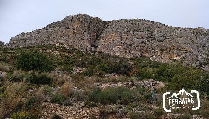 Desde la torrentera, tenemos que ir ascendiendo por los laterales de la misma, a veces atravesando de un lado al otro, el camino esta bastante roto y no es fácil de seguir, pero tenemos que ir hacia la montaña y enseguida se ve la ferrata a pie de la misma.