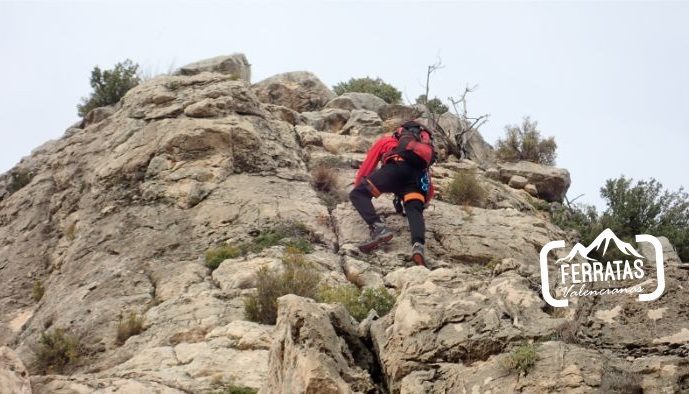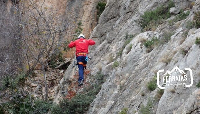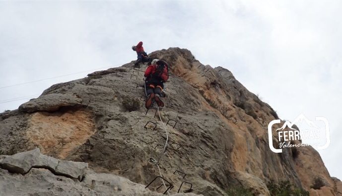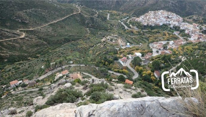 La ferrata comienza con un tramo vertical que gana altura rápidamente y nos lleva casi directos a un puente tibetano, cruzamos el mismo y ahora un pequeño tramo horizontal con cable de vida de cuerda. Nos deja de nuevo en otra pared y realizamos un tramo vertical de 15 metros, de nuevo otro tramo horizontal y ahora comienza un tramo vertical bastante largo donde se ve que el estado de la ferrata no es el más adecuado, con escalones bastante doblados, cable de pocos milímetros, algún escalón flojo, pero todo muy vertical. Unos 40 metros más arriba la ferrata tiende a la izquierda y es algo más tumbada, tras unos 15 metros llegamos a la parte final del cable. La ferrata continua, ahora sin cable, de frente, con una pequeña trepada y un poco más arriba algunas grapas que te ayudan a subir este tramo de pared, al finalizar la subida llegamos a una zona donde se encuentra una reunión con cadena. Las vistas del entorno y del pueblo son espectaculares.