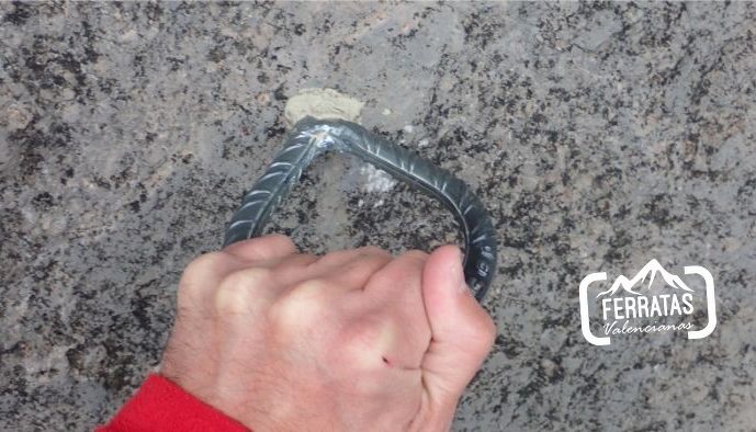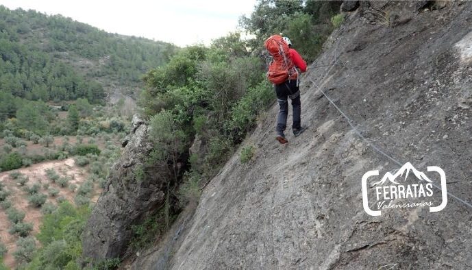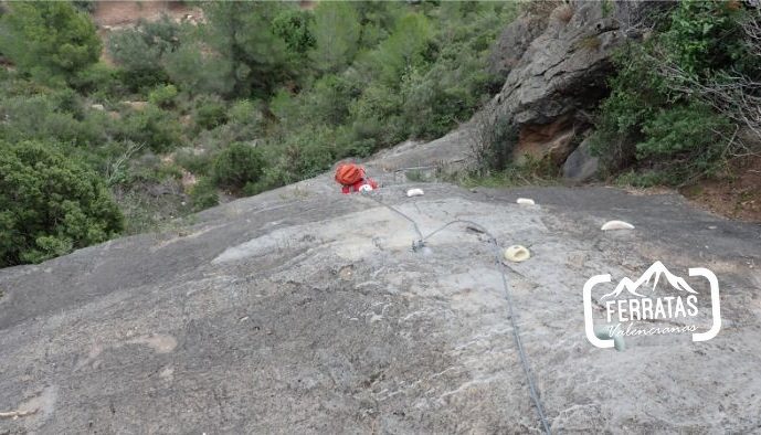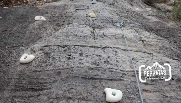 Es una ferrata bastante corta que tiene la mayor dificultad en el inicio de la misma, una vez pasado este pequeño desplome , la pared es menos vertical y tras unos 10 metros aparece a la izquierda un pasamanos que hace un recorrido en forma de rectángulo que vuelve a la ferrata, continuamos la ascensión y como curiosidad han puesto presas de escalada, tras otros 10 metros llegamos a un tramo horizontal que nos deja en el rápel.